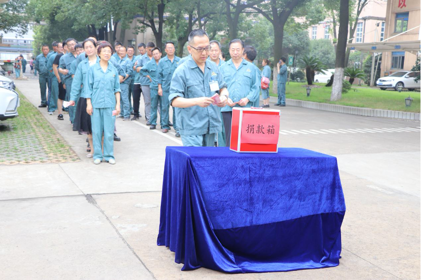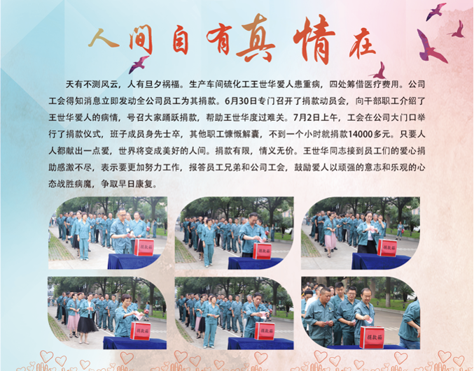 有不測風云,人有旦夕禍福。生產(chǎn)車間硫化工王世華愛人患重病,四處籌借醫(yī)療費用。公司工會得知消息立即發(fā)動全公司員工為其捐款。6月30日專門召開了捐款動員會,向干部職工介紹了王世華愛人的病情,號召大家踴躍捐款,幫助王世華度過難關。7月2日上午,工會在公司大門口舉行了捐款儀式,班子成員身先士萃,其他職工慷慨解囊,不到一個小時捐款14000多元。只要人人都獻出一點愛,世界將變成美好的人間。捐款有限,情義無價。王世華同志接到員工們的愛心捐助感激不盡,表示要更加努力工作,報答員工兄弟和公司工會,鼓勵愛人以頑強的意志和樂觀的心態(tài)戰(zhàn)勝病魔,爭取早日康復。