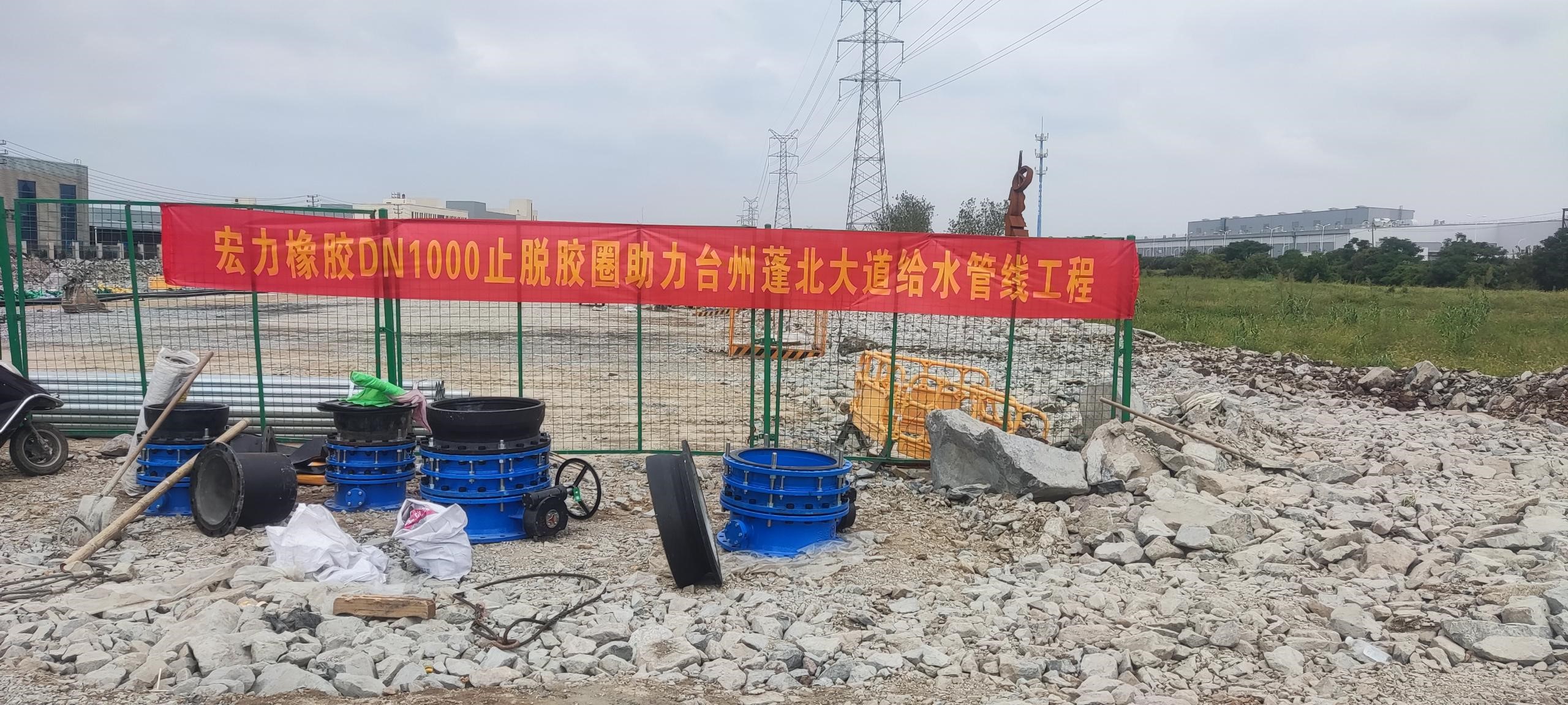 臺州濱海工業(yè)區(qū)蓬北大道新鋪一條DN1000輸水管線,施工工地土質(zhì)松軟、碎石遍布,地質(zhì)情況十分復(fù)雜。為了防止管線沉降,造成管道接口漏水,施工方?jīng)Q定使用“宏力”牌DN1000止脫膠圈解決問題,由于施工工期緊,急需膠圈送到現(xiàn)場。宏力橡膠接到購貨需求,立即安排售后人員攜帶膠圈趕到現(xiàn)場,當(dāng)天到達(dá)當(dāng)天安裝到位,展示了防滑止脫膠圈安裝方便快捷、密封效果好的優(yōu)點(diǎn)。